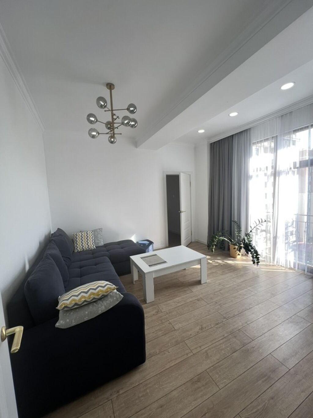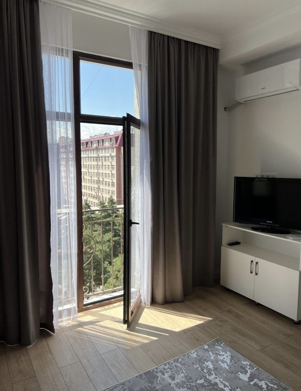 Просторная гостиная с панорамной дверью и выходом на балкон