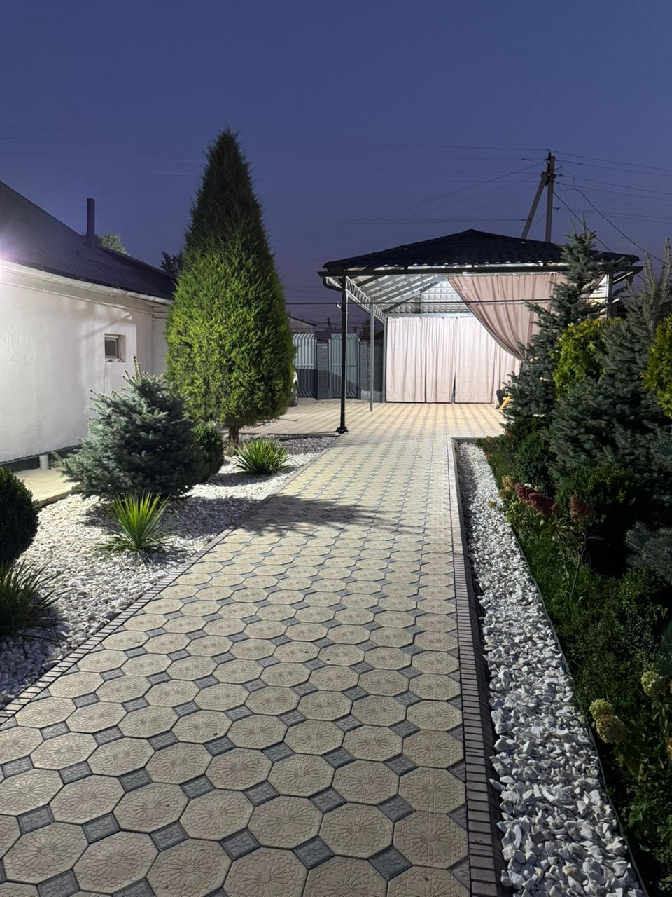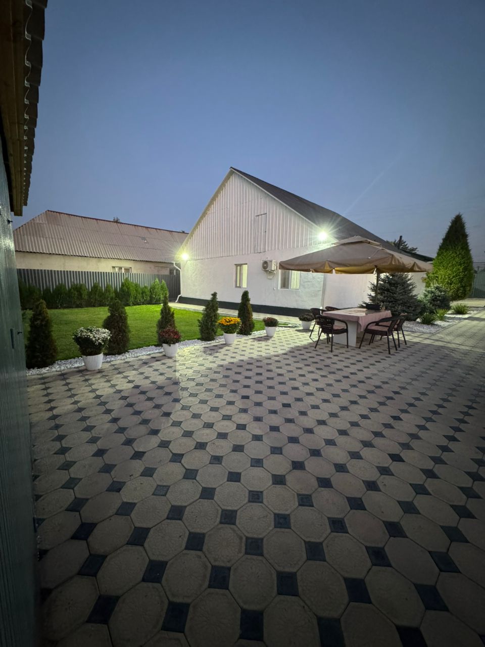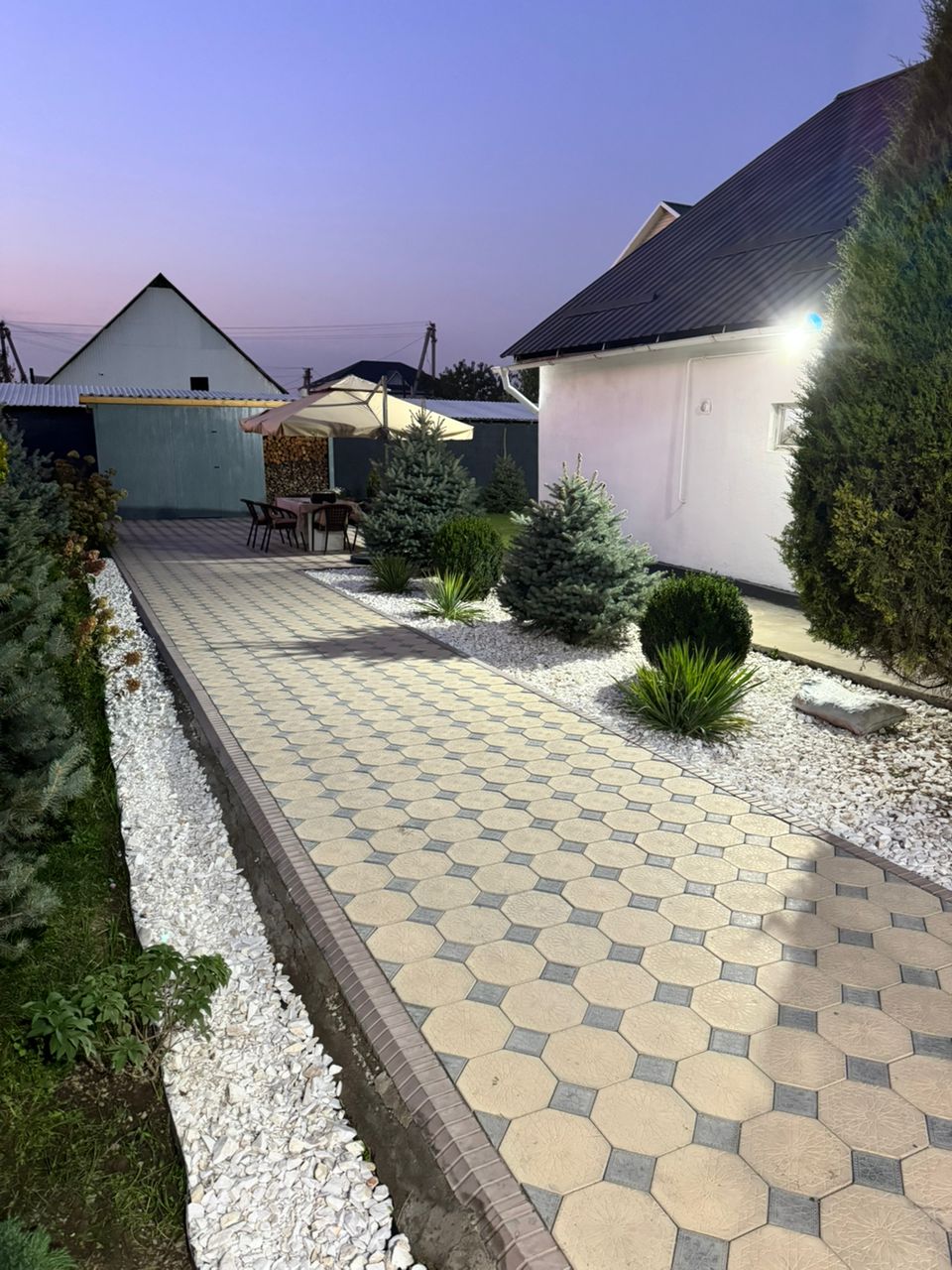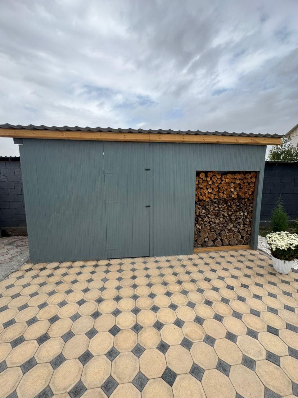 Двор — брусчатка, ландшафтный сад, газон, зона отдыха, хозблок с дровником