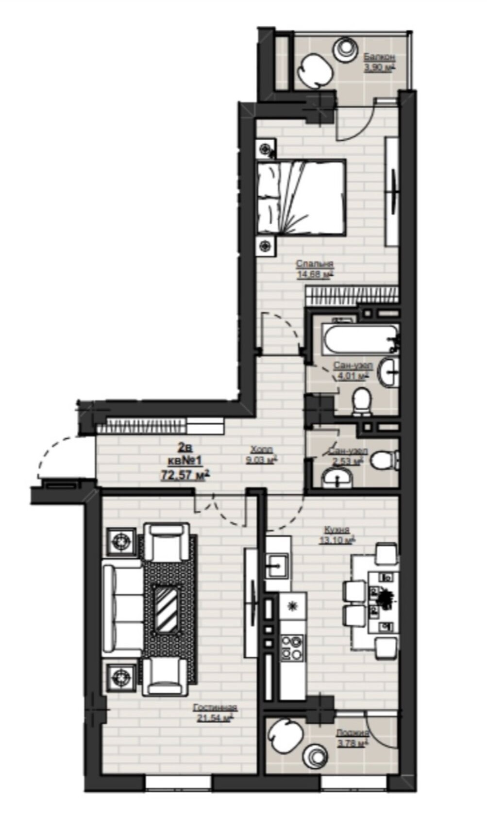 Площадь 72.57м2